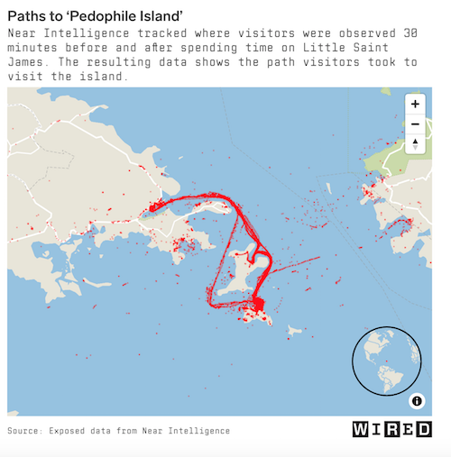 Per wired.com, Near Intelligence was “able to map the paths of these visitors to within centimetersincluding their neighborhoods, buildings of origins, and the paths they took to get to the island. These digital trails document the numerous trips of wealthy and influential individuals, seemingly undeterred by Epstein’s status as a convicted sex offender.”