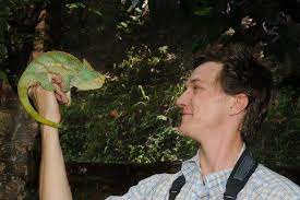 Here’s a photo of Oxford University Ornithologist John Mittermeier, holding a Satanic green iguana, against a Satanic green background; John’s turned so only his left eye is visible: